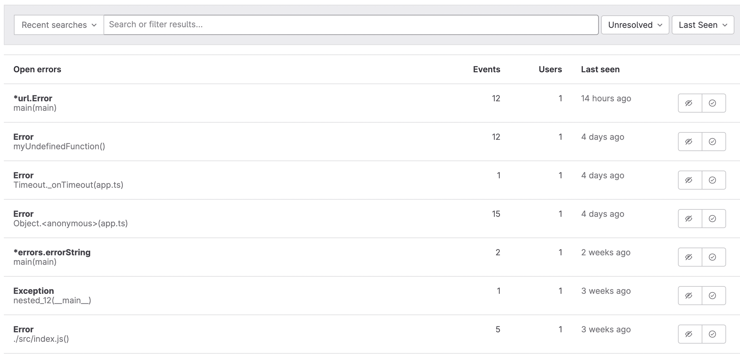 Go to Monitor > Error Tracking to see the list of open errors: