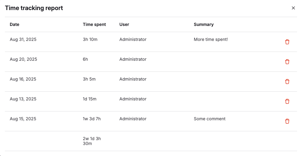 - In the time tracking report, on the right of a timelog entry, select Delete time spent ({remove}).